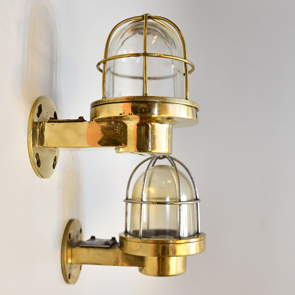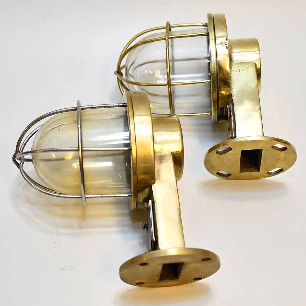 This matching pair of 90 degree brass nautical lights comes from old passenger ships that sailed in the 1970s and 1980s. Made from solid marine-grade brass with clear glass shades, they’re designed like traditional angled security lights – strong and reliable for ship passages.