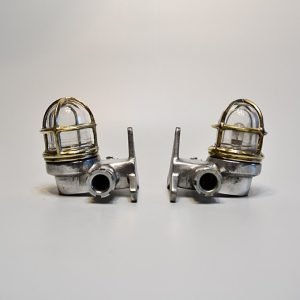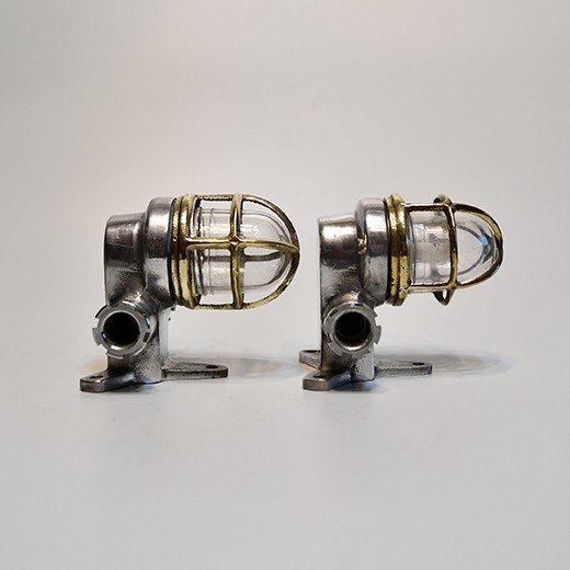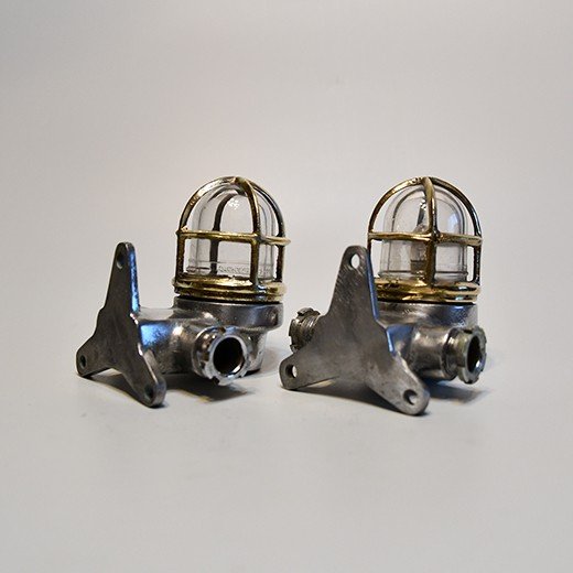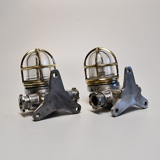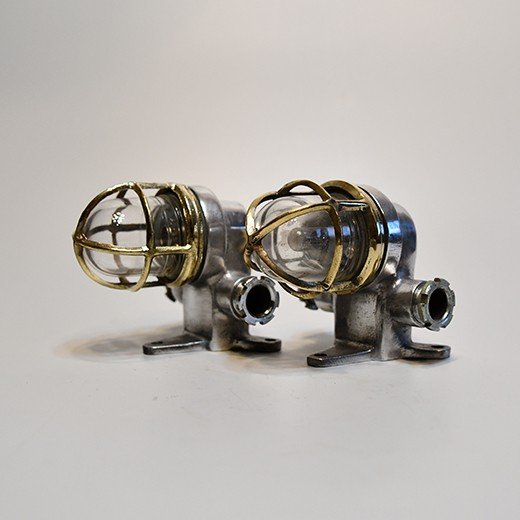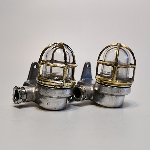 This matching pair of aluminium nautical bulkhead pair comes from old cargo ships that sailed from the 1950s to the 1980s. Made from marine-grade aluminium with solid brass protective cages, they’re designed for tough ship conditions – strong and reliable for safe passage lighting.
