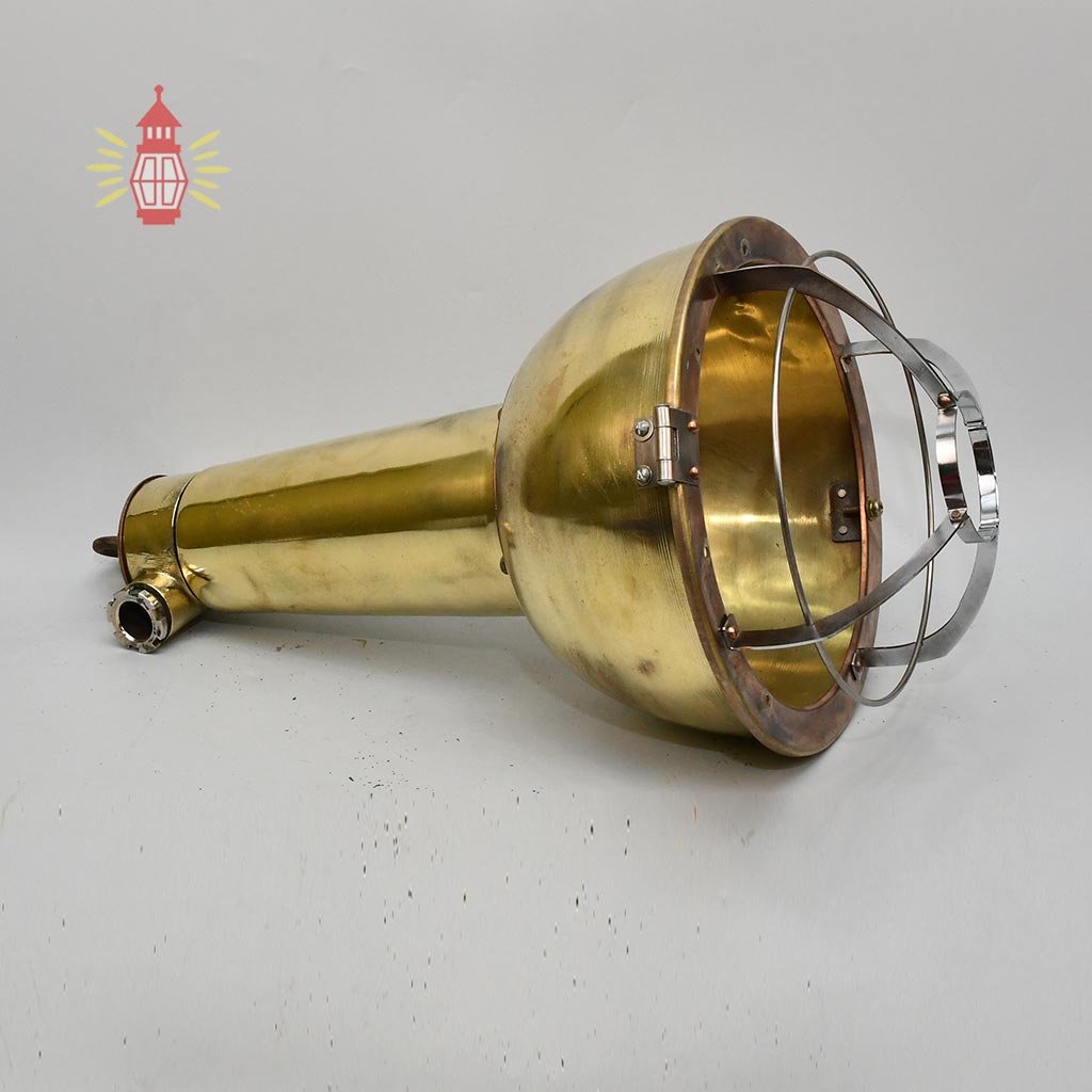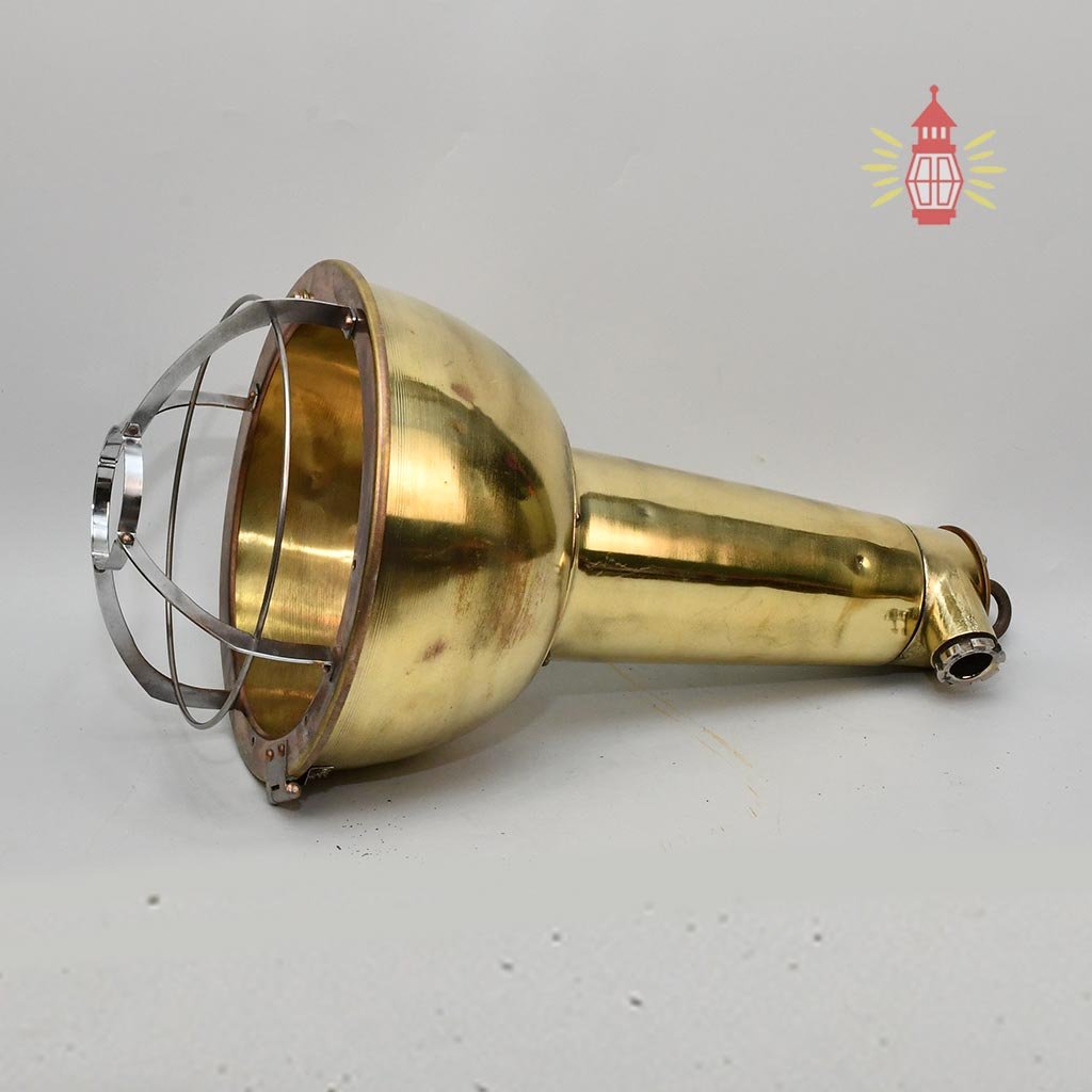 This brass hanging deck light is a real cargo spot lamp from old ships. Made from solid marine-grade brass with a large bell shade and strong cage, it’s built for tough deck conditions – reliable and bright for safe working light on ships.