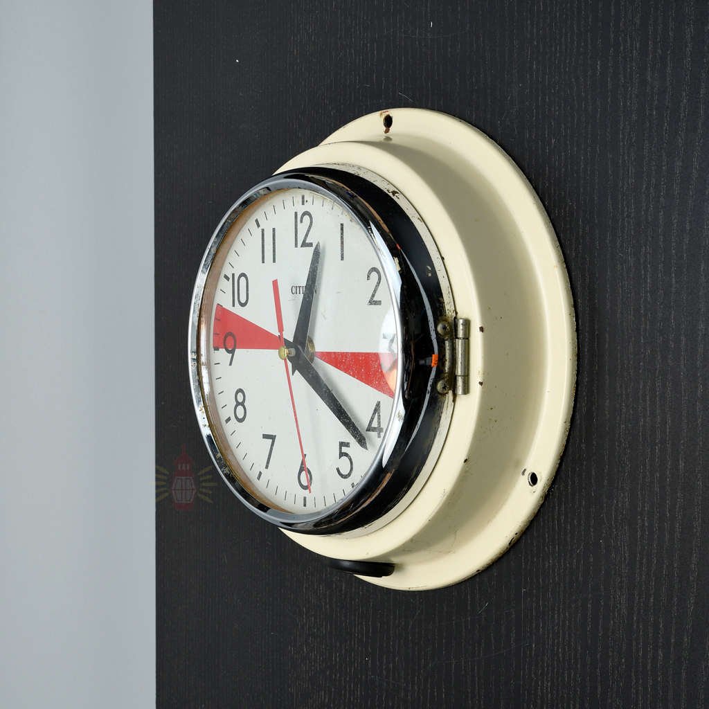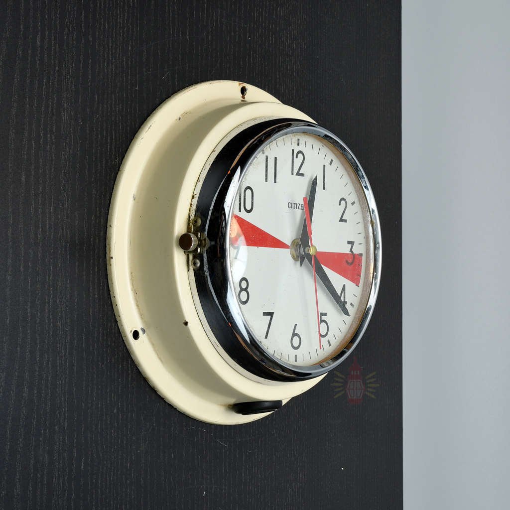 We reclaimed this Citizen clock with its red dial from old working ships. Radio silence clocks like this helped crews mark quiet times for emergency signals. Small marks or aged spots share its unique story from real maritime life.