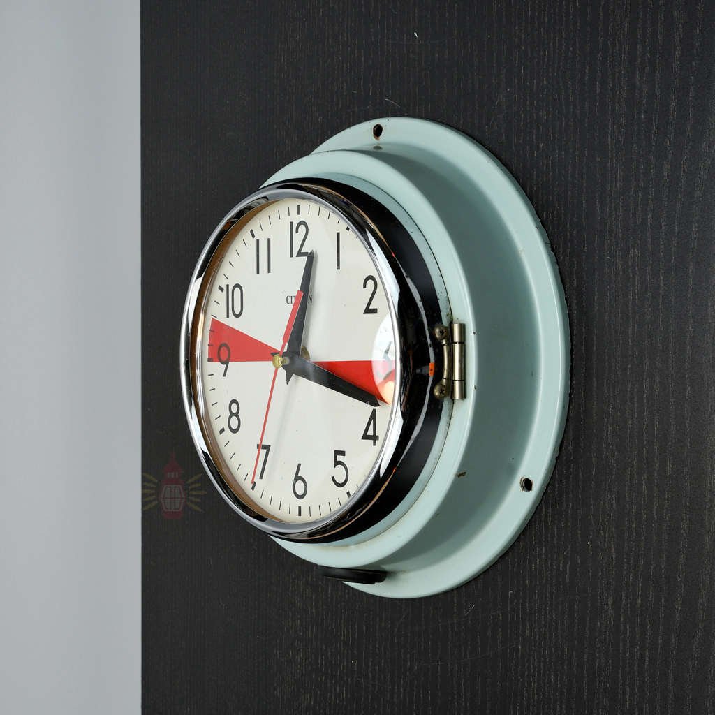We reclaimed this Citizen clock with its red dial from old working ships. Radio room clocks like this helped crews mark silence periods for emergency signals. Small marks or aged spots share its unique story from real maritime life.