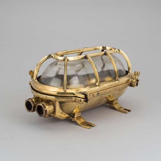 Original brass bulkhead marine antique light from Ship Engine Room and that can be used as ships furniture. oval bulkhead light with clear glass & cage. With a simplistic design, the Ruben Small Oval Marine Light adds an industrial touch to any outdoor space. Its understated design is the perfect fit for porches, playrooms, common areas, or poolside. Extremely versatile, this 1950s inspired ship light adds nautical charm and can be used as a wall or ceiling fitting both indoors or outdoors. Suitable for any minimalist or industrial style setting, this oval marine bulkhead light adds nautical charm while lighting the exterior of a home. These quality designed lights, lend themselves to all sorts of design projects in homes or retail environments.