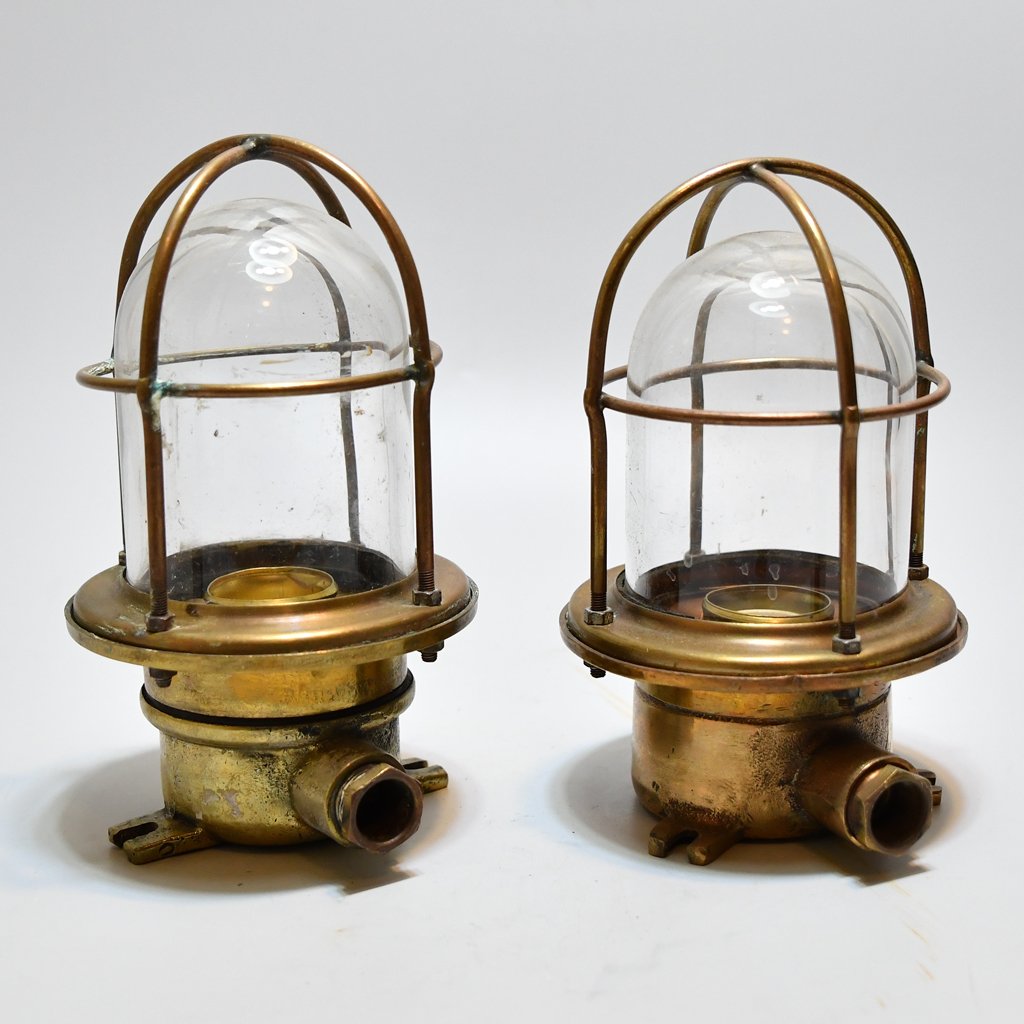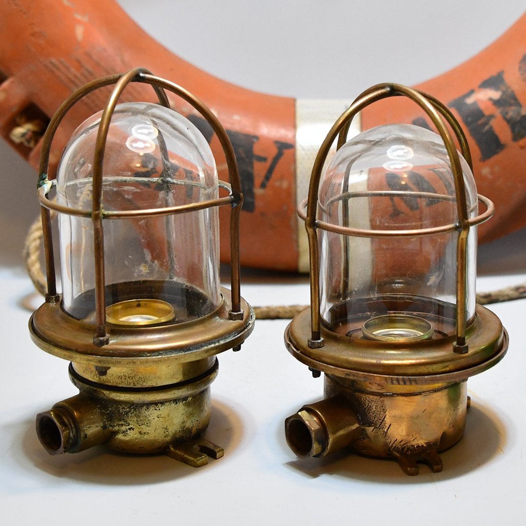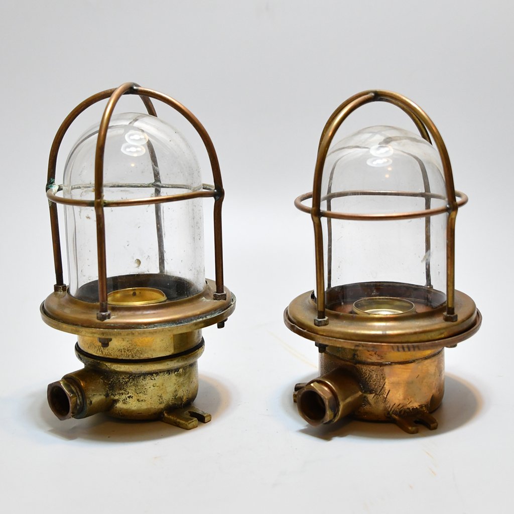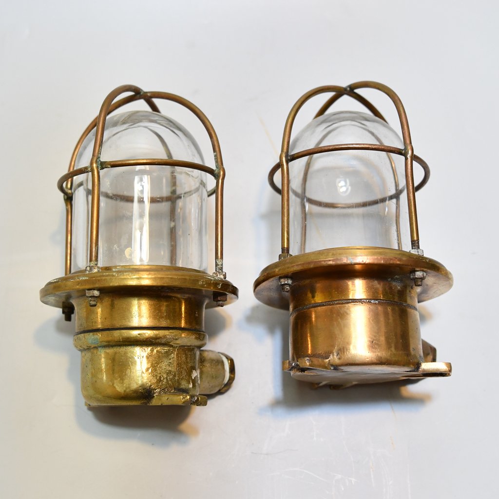 Pair of Small Wall mounted Passageway Caged lights : These small lights obtained from 1940s Japanese Ship. These light can be used for indoor and outdoor purposes too, but we suggest mainly to use them in Bathroom ,ship yachts and nautical decors.it gives a classic look to your project. The Brass doesn’t rust and cost only a little more than plastic reproduction.