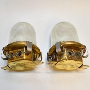 Authentic Vintage Pair Brass Nautical Ship Security Lights with Ribbed Glass