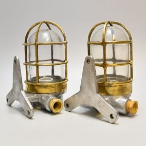 Authentic Vintage Pair Brass Caged Nautical Post Lights with Aluminium Mounts