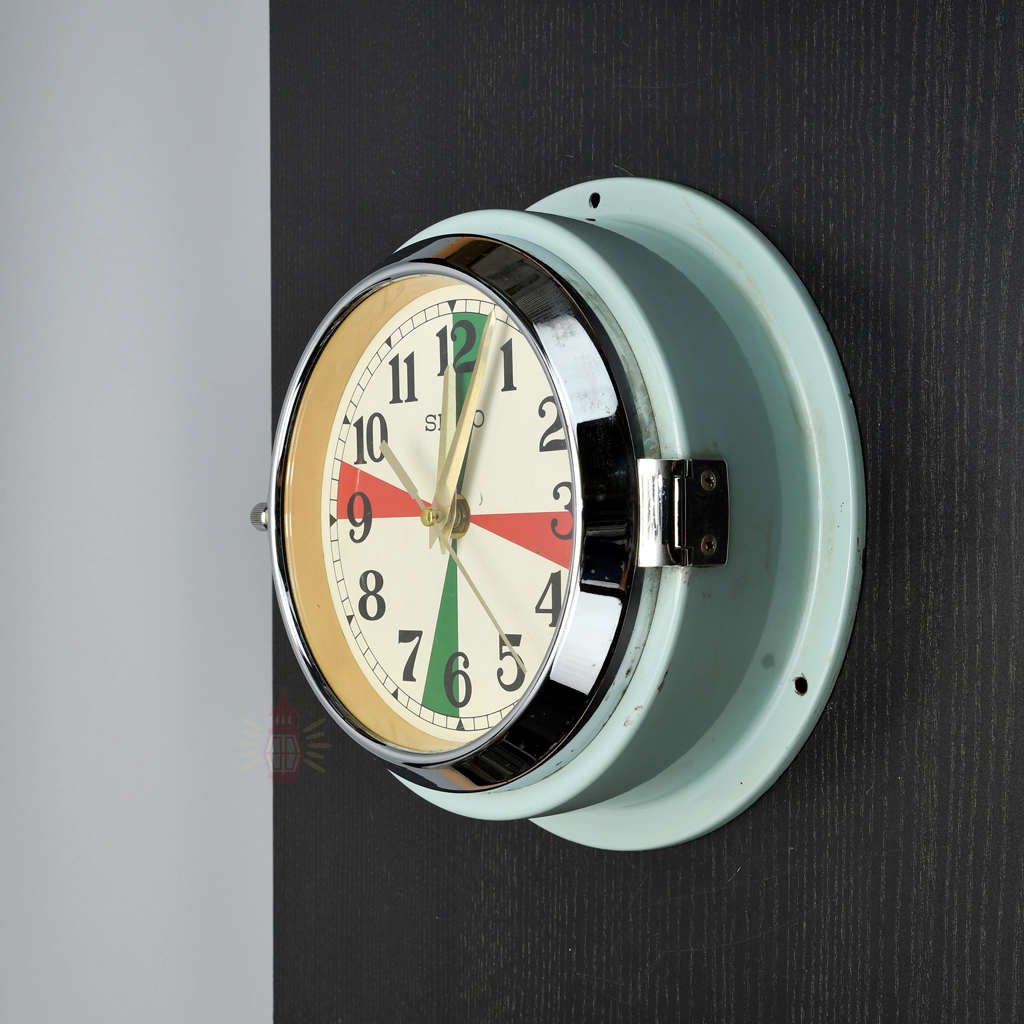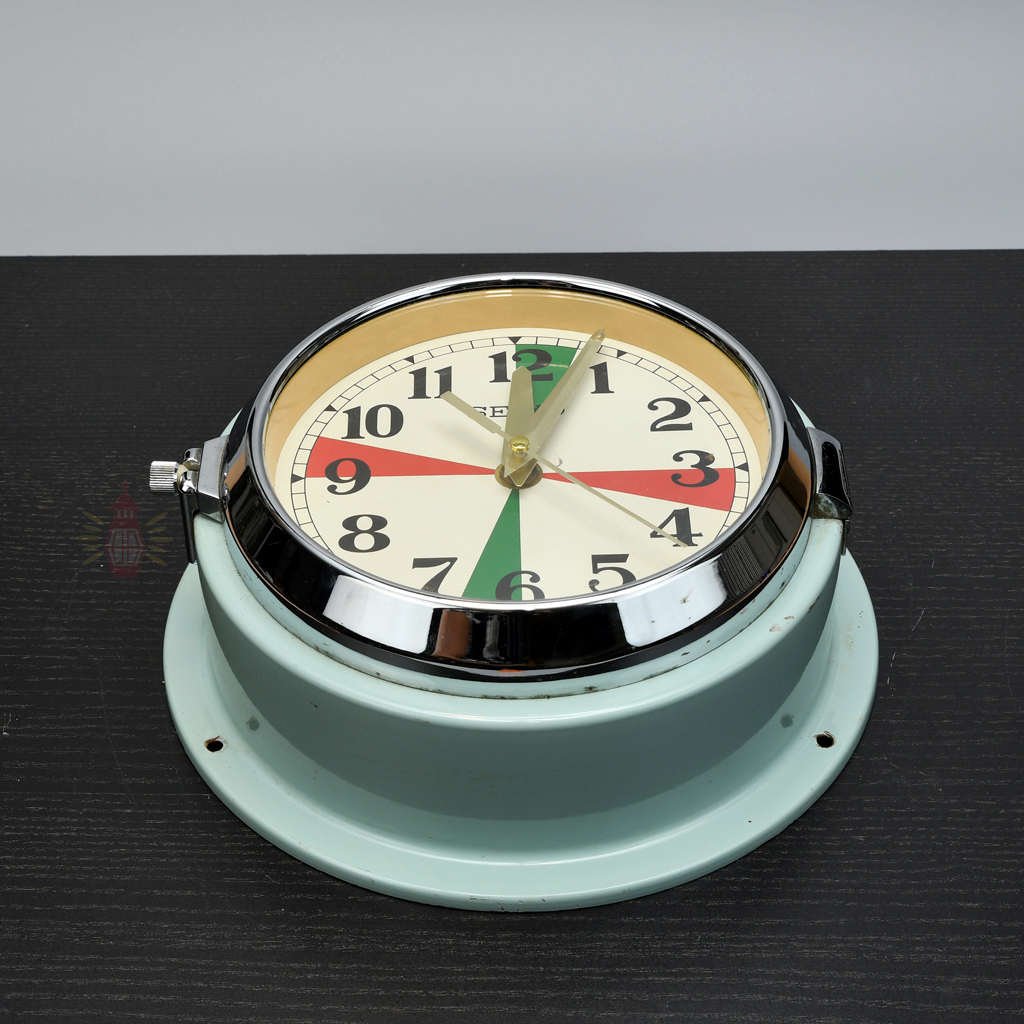 We reclaimed this original Seiko clock with its colourful dial from old working ships made in Japan. Seiko marine radio room clocks like this helped crews mark silence periods for emergency signals. Small marks or aged spots share its unique story from real maritime life.