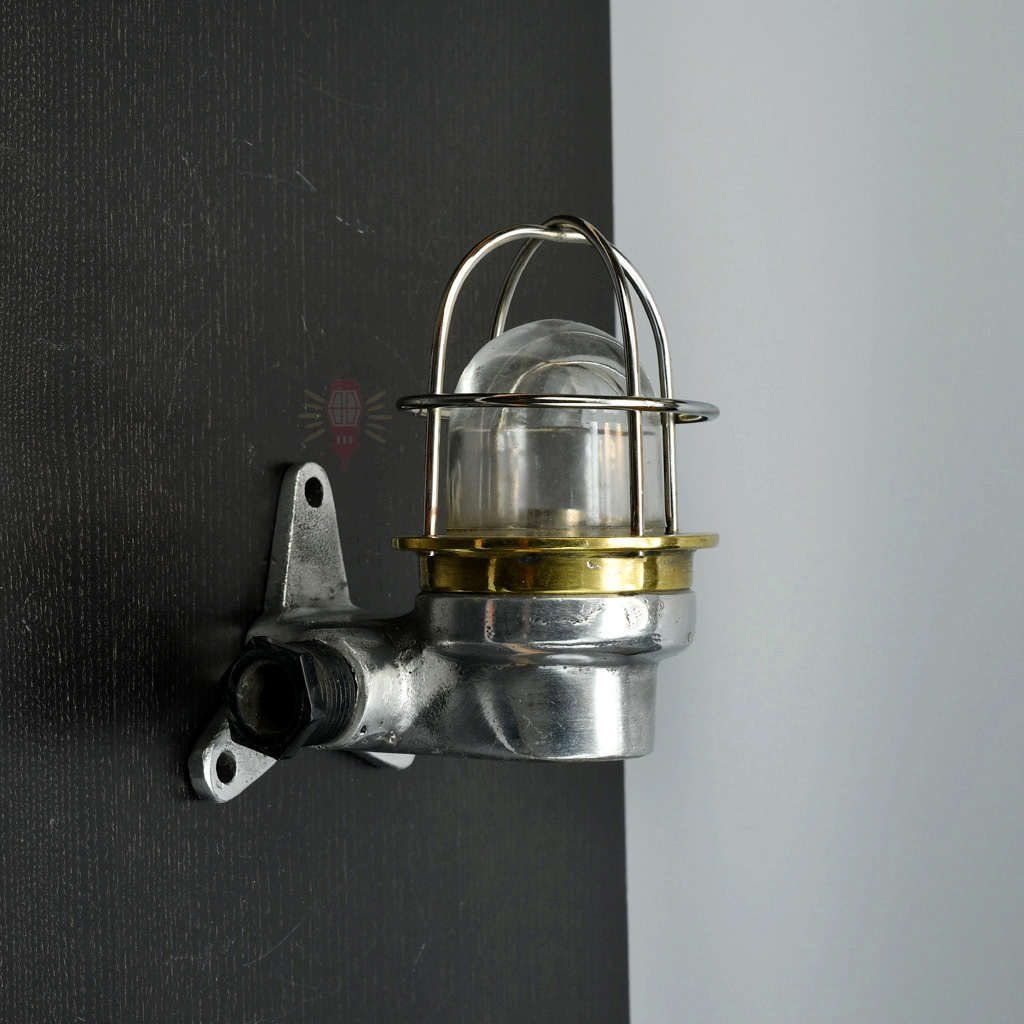 This aluminium nautical wall light is an original antique from 1950s cargo vessels. Made from marine-grade aluminium with a brass cage and thick glass shade, it’s designed for tough ship conditions – strong and reliable for safe passage lighting.