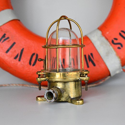 The brass cage shields the thick glass lens – traditional design for safe ship passage lighting in rough conditions.