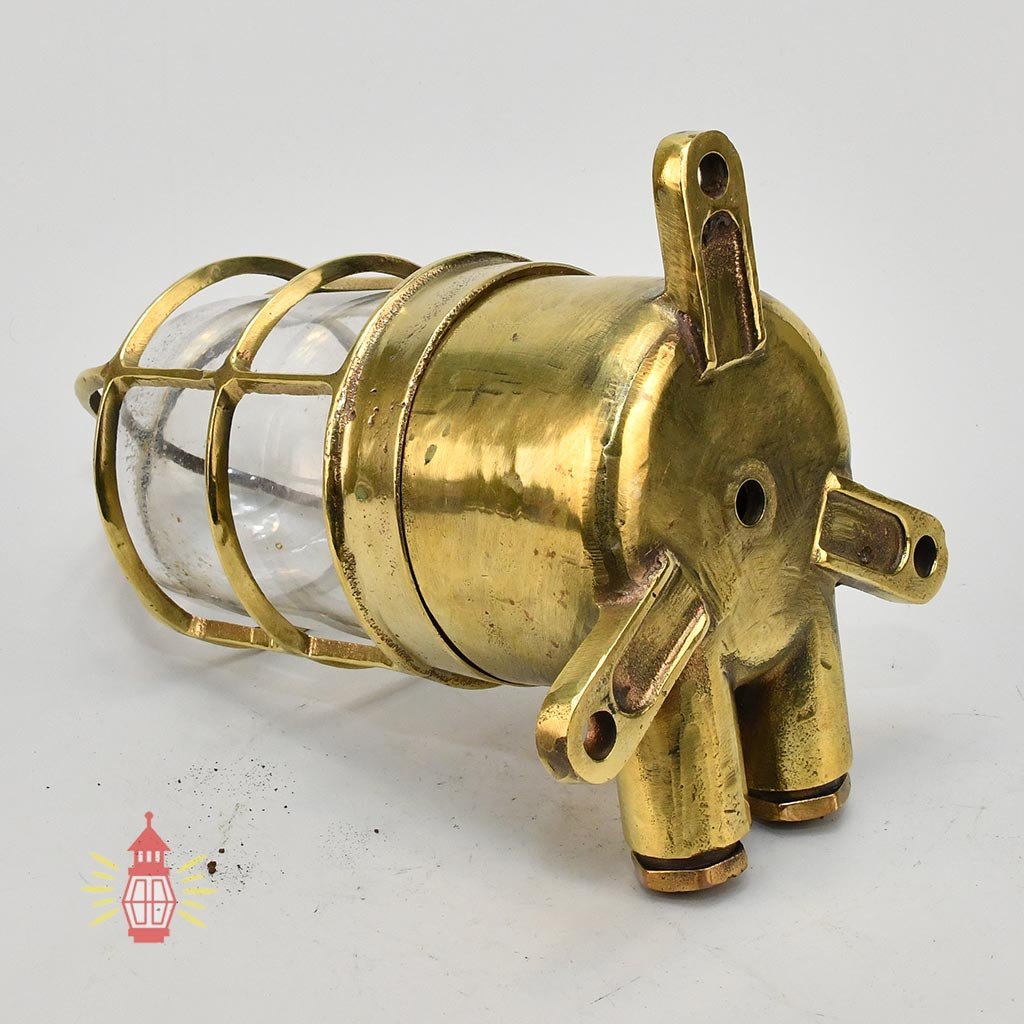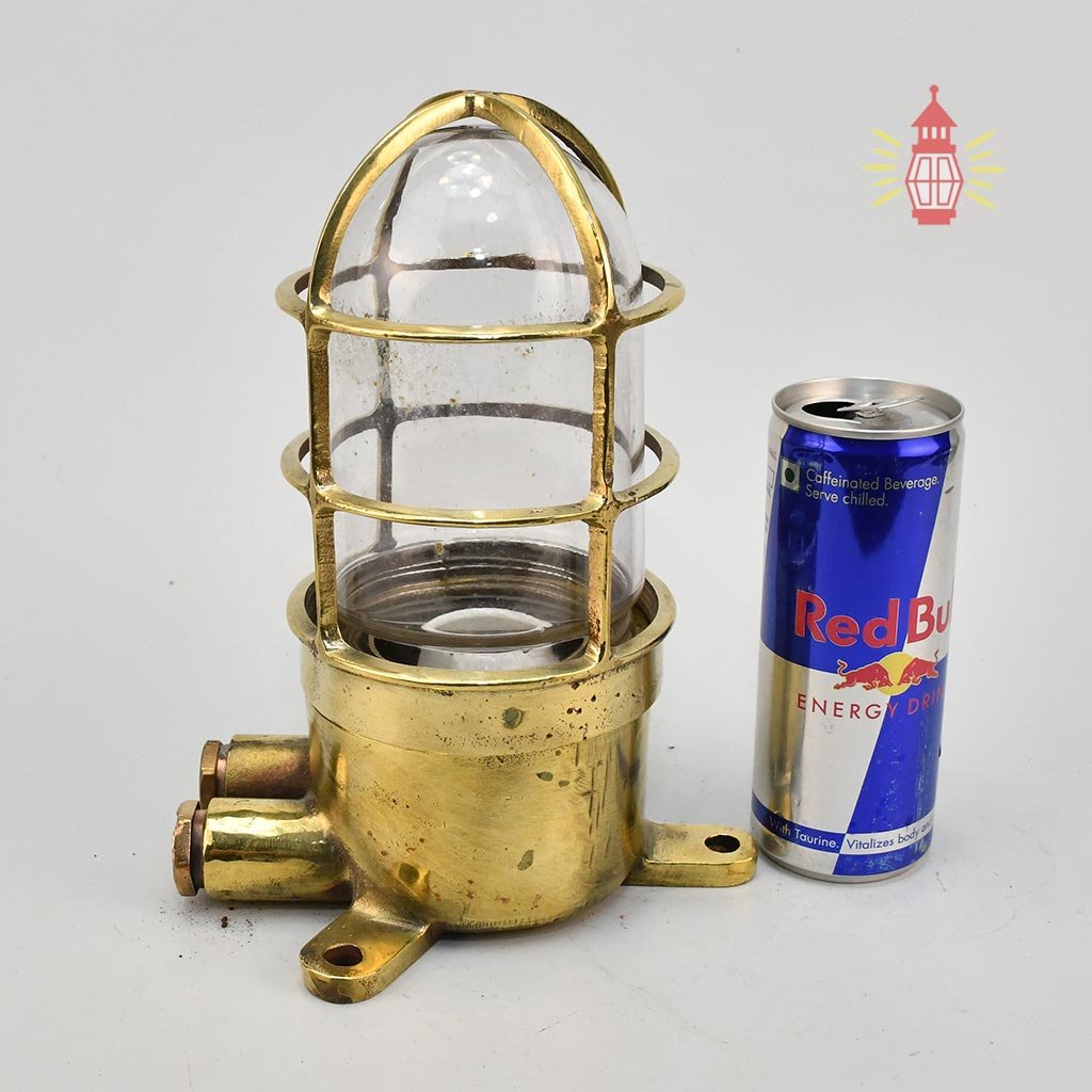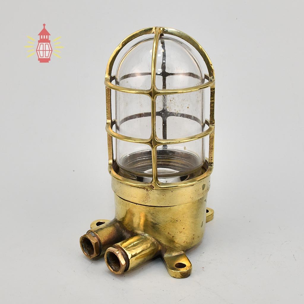 This brass nautical passage light comes from old cargo vessels that sailed from the 1950s to the 1980s. Made from solid marine-grade brass with a protective cage and thick clear glass shade, it’s designed for tough ship conditions – strong and reliable for safe passage lighting.