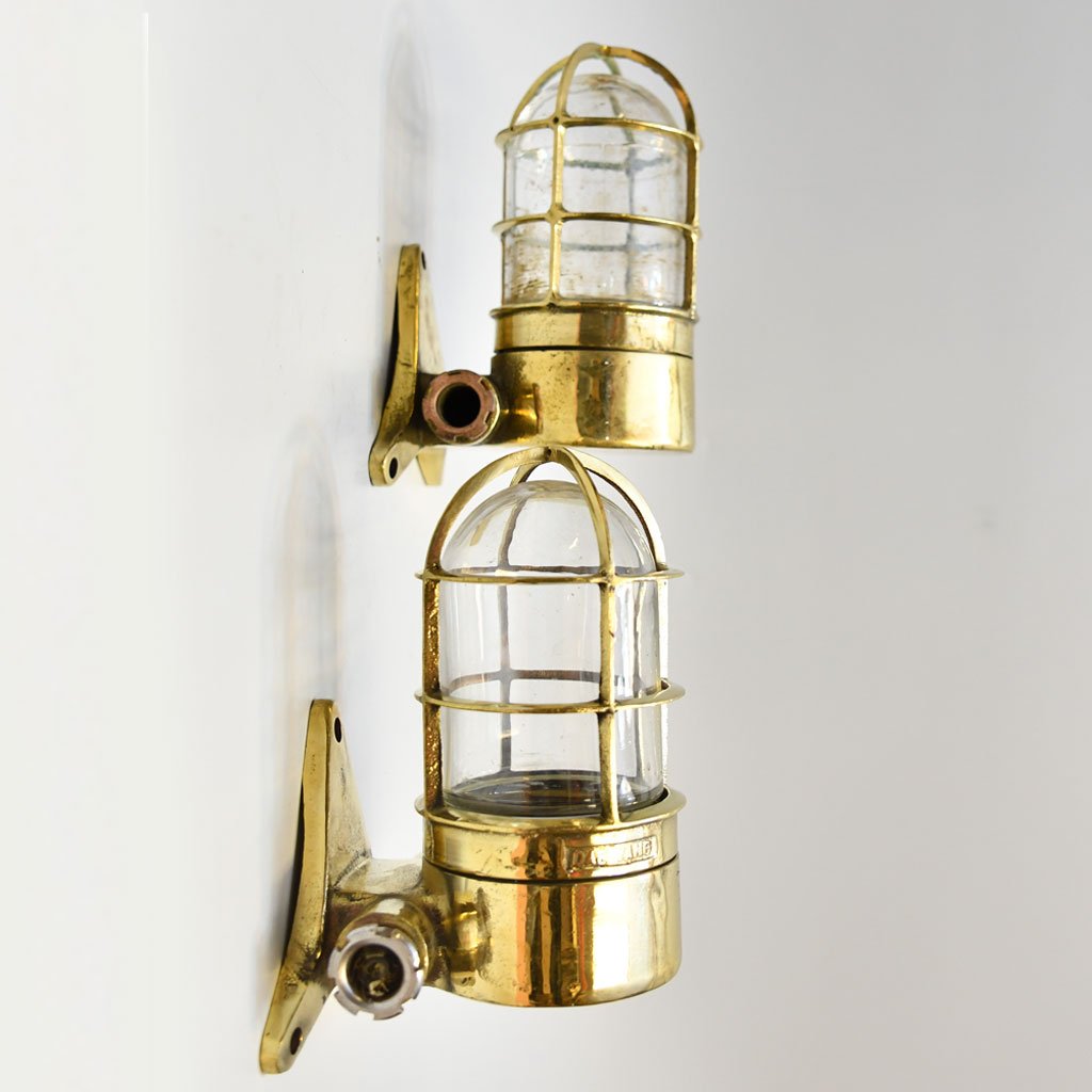 Light narrow spaces with real seafaring charm using this restored pair of vintage nautical ban lights. Made from solid brass with protective cage and clear glass, the set weighs a comfortable 2.8 kg. The premium marine construction and polished finish deliver lasting quality far beyond lightweight modern alternatives.